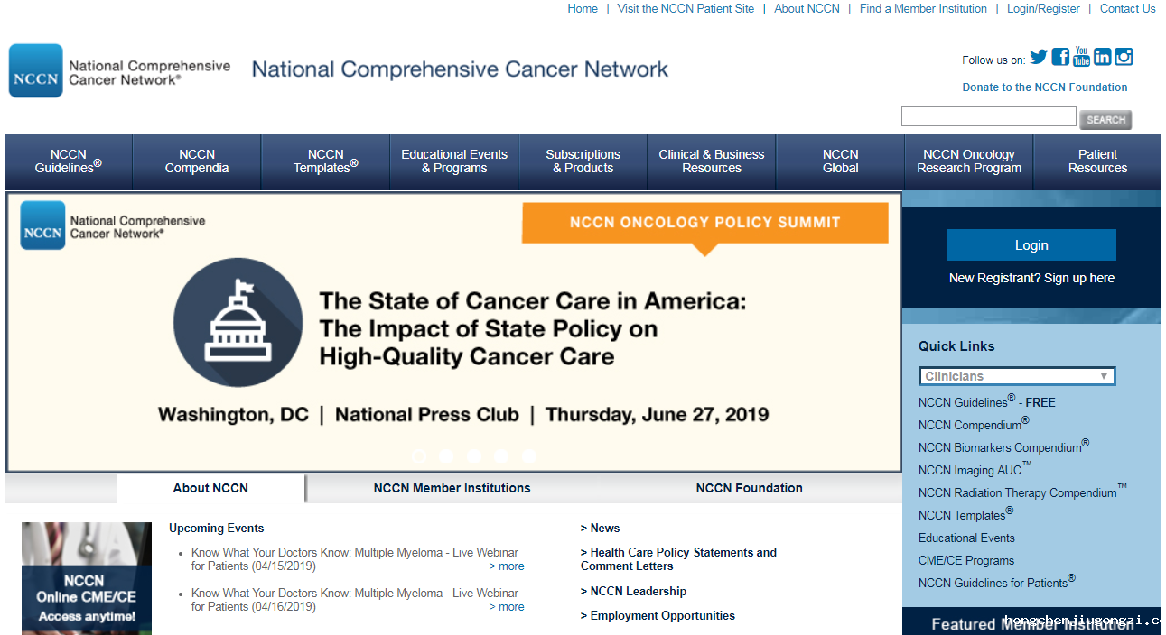 NCCN(National Comprehensive Cancer Network, NCCN)国家综合癌症网络由美国28个主要癌症中心组成的非盈利联盟,致力于肿瘤患者的护理、研究和教育,改善和促进高质量、有效、高效和可获得的癌症护理,使患者过上更好的生活。通过NCCN成员机构临床专业人员的领导和专业知识,NCCN为卫生保健提供系统中的众多利益攸关方提供有价值的信息。自NCCN成员机构的世界知名专家诊断和治疗各种癌症患者,并被认为是处理复杂、侵袭性或罕见癌症的专家。