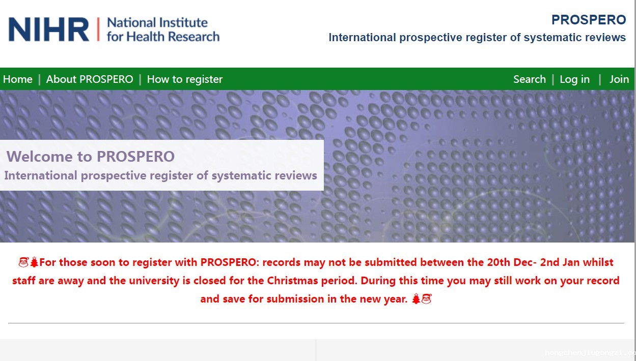 PROSPERO是一个由美国国立卫生研究院(National Institute for Health Research , NIHR)资助的面向全球的系统综述注册数据库,该数据库旨在提供统一的有关健康研究(包括护理、社会福利、公共卫生、教育、犯罪、司法和国际发展)的系统评价。并作为永久记录进行维护。PROSPERO旨在提供一开始就注册的系统评价的完整列表,以通过将已完成的评价与方案中计划的进行比较来帮助避免重复并减少报告偏差的机会。PROSPERO上的系统评价方案可以包括任何研究设计的任何类型,此外还接受对至少包含直接与患者或临床相关的一项结果的方法学问题的复查和复查。