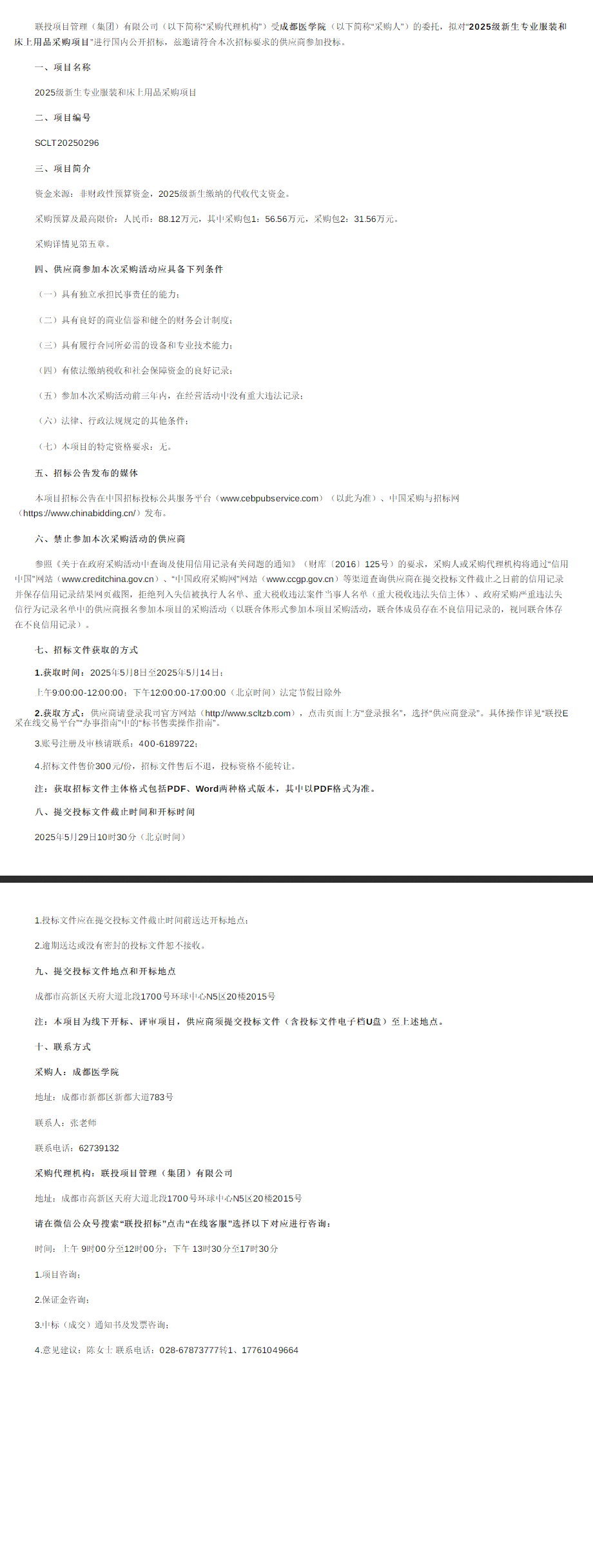 2025级新生专业服装和床上用品采购项目公开招标采购公告