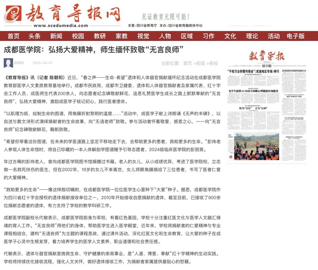 《教育导报》讯(记者 陈朝和)近日,“春之声——生命·希望”遗体和人体器官捐献缅怀纪念活动在bv1946伟德官网手机版教育部医学人文素质教育基地举行。成都市民政局、成都市卫健委、遗体和人体器官捐献者及家属代表、红十字会工作人员、成医师生代表200余人,向志愿者纪念碑敬献鲜花,追思礼赞医学生成长之路上默默奉献的“无言良师”,弘扬大爱精神,激励成医学子铭记初心,践行医者使命。