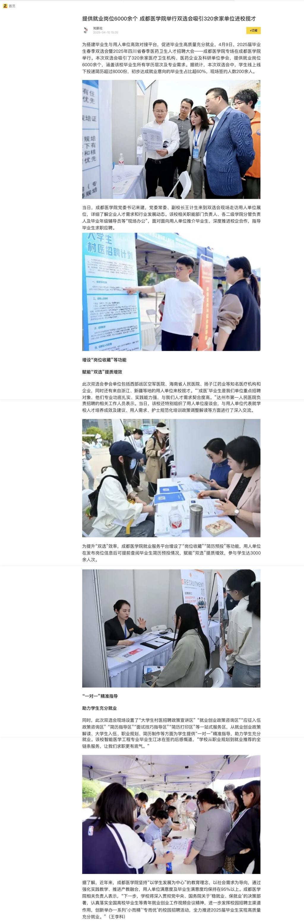 此次双选会参会单位包括西部战区空军医院、海南省人民医院、扬子江药业等知名医疗机构和企业,同时还有来自浙江、新疆等地的用人单位来校揽才。“‘成医’毕业生是我们单位重点招聘对象,他们专业功底扎实、实践能力强,与我们人才需求契合度高。”达州市第一人民医院负责招聘的相关工作人员表示。当日,该校还特别组织了用人单位座谈会,与用人单位代表就学校人才培养成效及建议、用人需求、护士规范化培训政策调整解读等方面进行了深入交流。