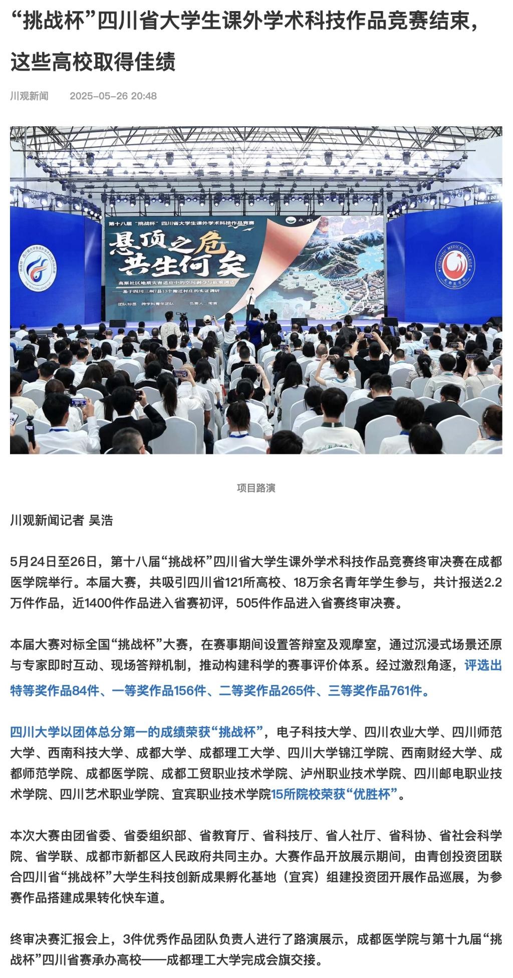 5月24日至26日,第十八届“挑战杯”四川省大学生课外学术科技作品竞赛终审决赛在bv1946伟德官网手机版举行。本届大赛,共吸引四川省121所高校、18万余名青年学生参与,共计报送2.2万件作品,近1400件作品进入省赛初评,505件作品进入省赛终审决赛。