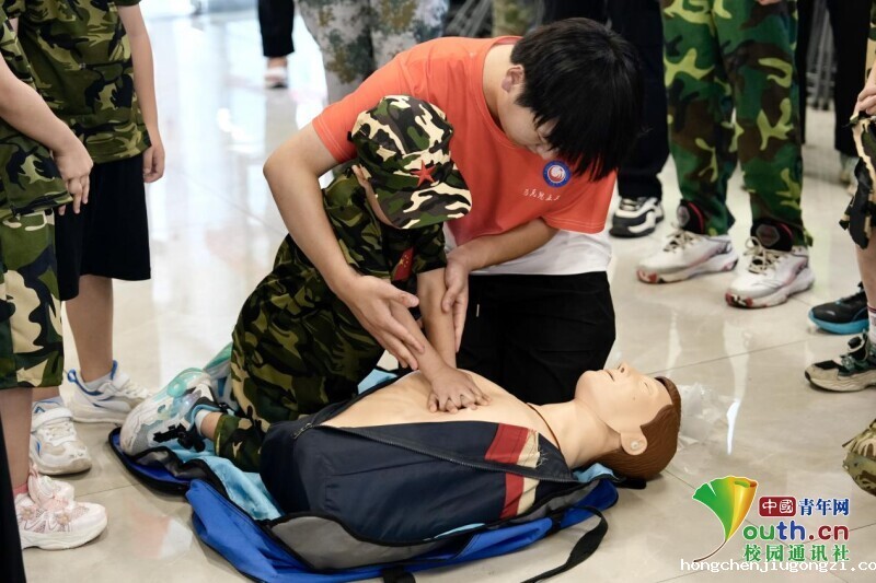 图为实践团成员刘洋手把手指导营地小学生心肺复苏。李秋樵 供图