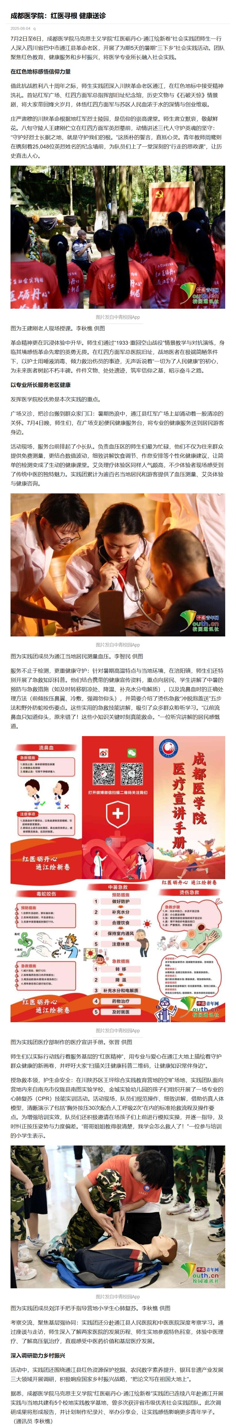7月2日至6日,bv1946伟德官网手机版马克思主义学院“红医砺丹心·通江绘新卷”社会实践团师生一行人深入四川省巴中市通江县革命老区,开展了为期5天的暑期“三下乡”社会实践活动。团队聚焦红色教育、健康服务和乡村振兴,将医学专业所长融入社会实践。